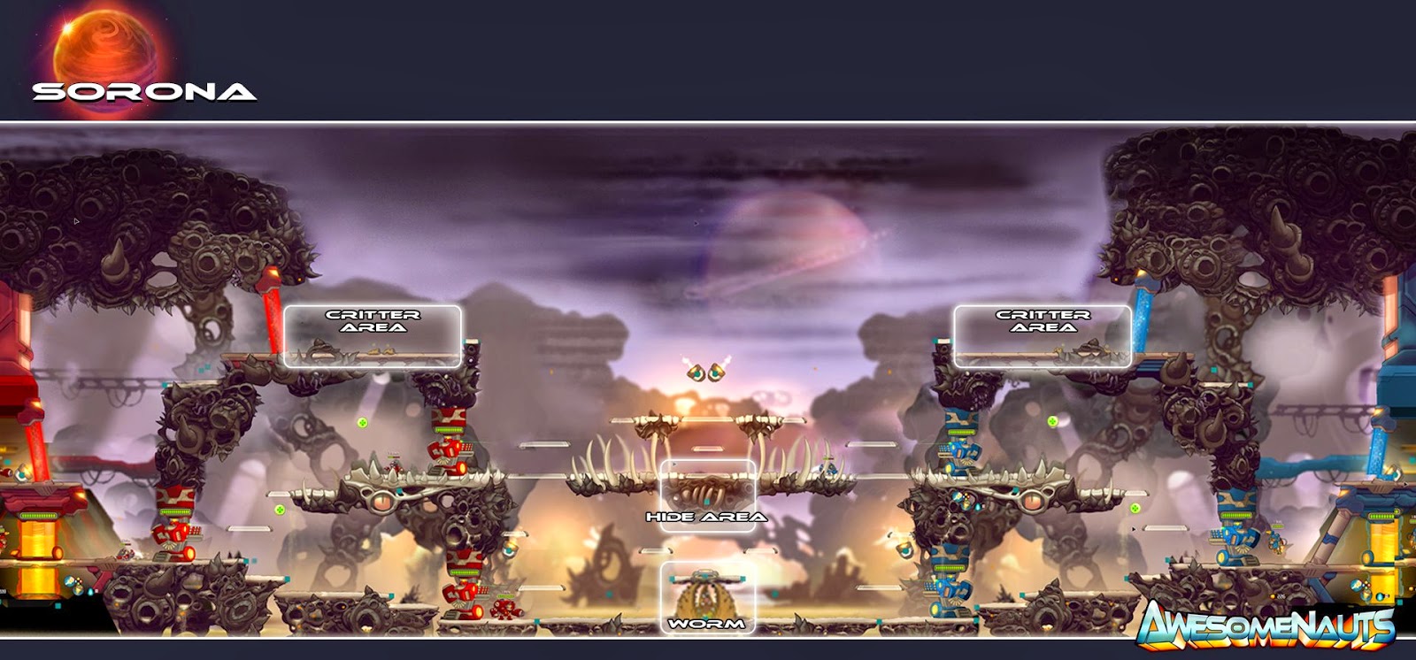 Já em Sorona os neutros também ficam na parte acima da rota superior. Já no Bot é onde se encontra a melhor parte do mapa, há um Verme que engole pessoas! Mas calma, ele só aparece quando algum Naut pisa no botão e aciona a fenda que o libera. Não podemos negar que é extremamente divertido fazer o inimigo desaparecer com um “toque de botão”.