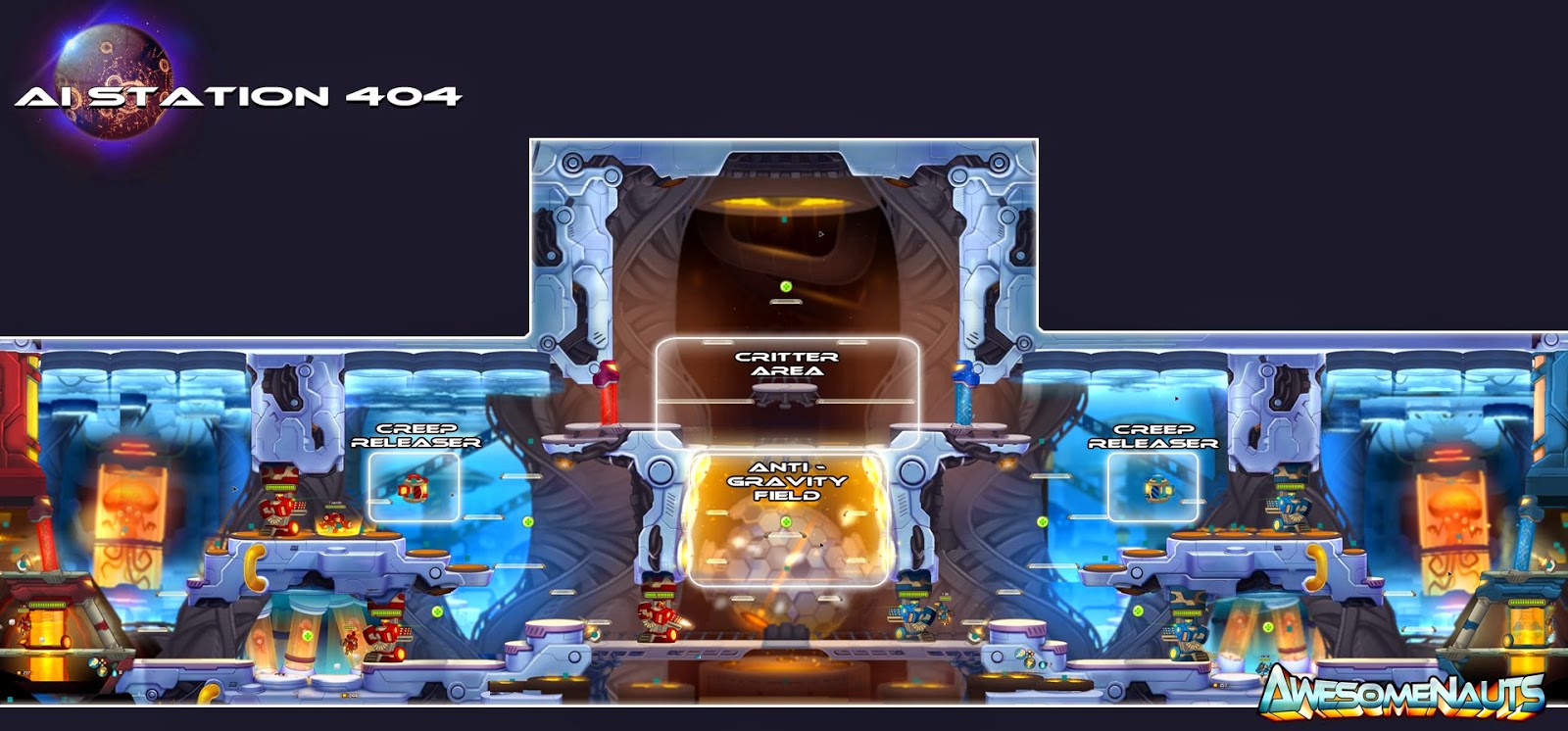 Neste mapa temos um campo gravitacional ao centro e próximo da rota Superior temos um lugar onde de tempos em tempos dão respawn Creeps mais fortes, você deverá pular em cima do botão para libera-los.